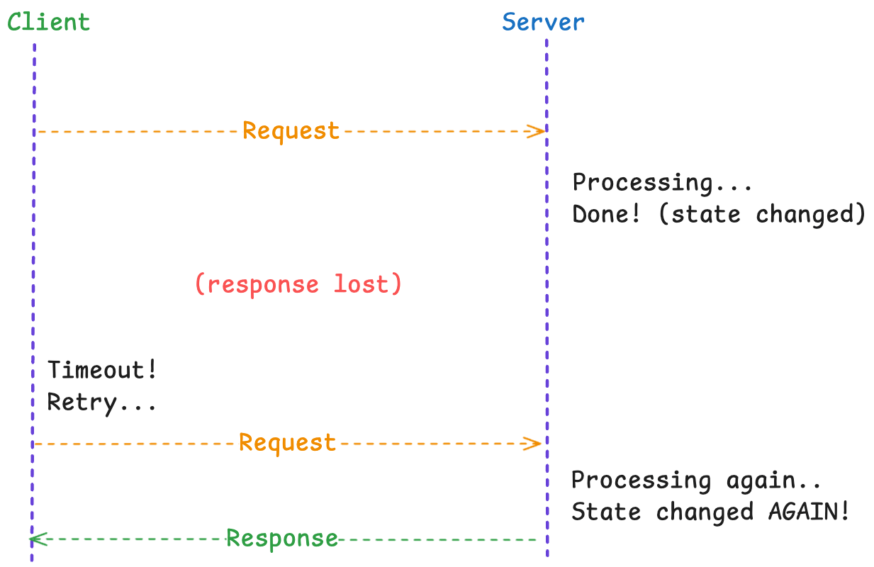 The client sees success on the retry. It has no idea the operation ran twice. Without idempotency, we have just doubled the effect of that operation.